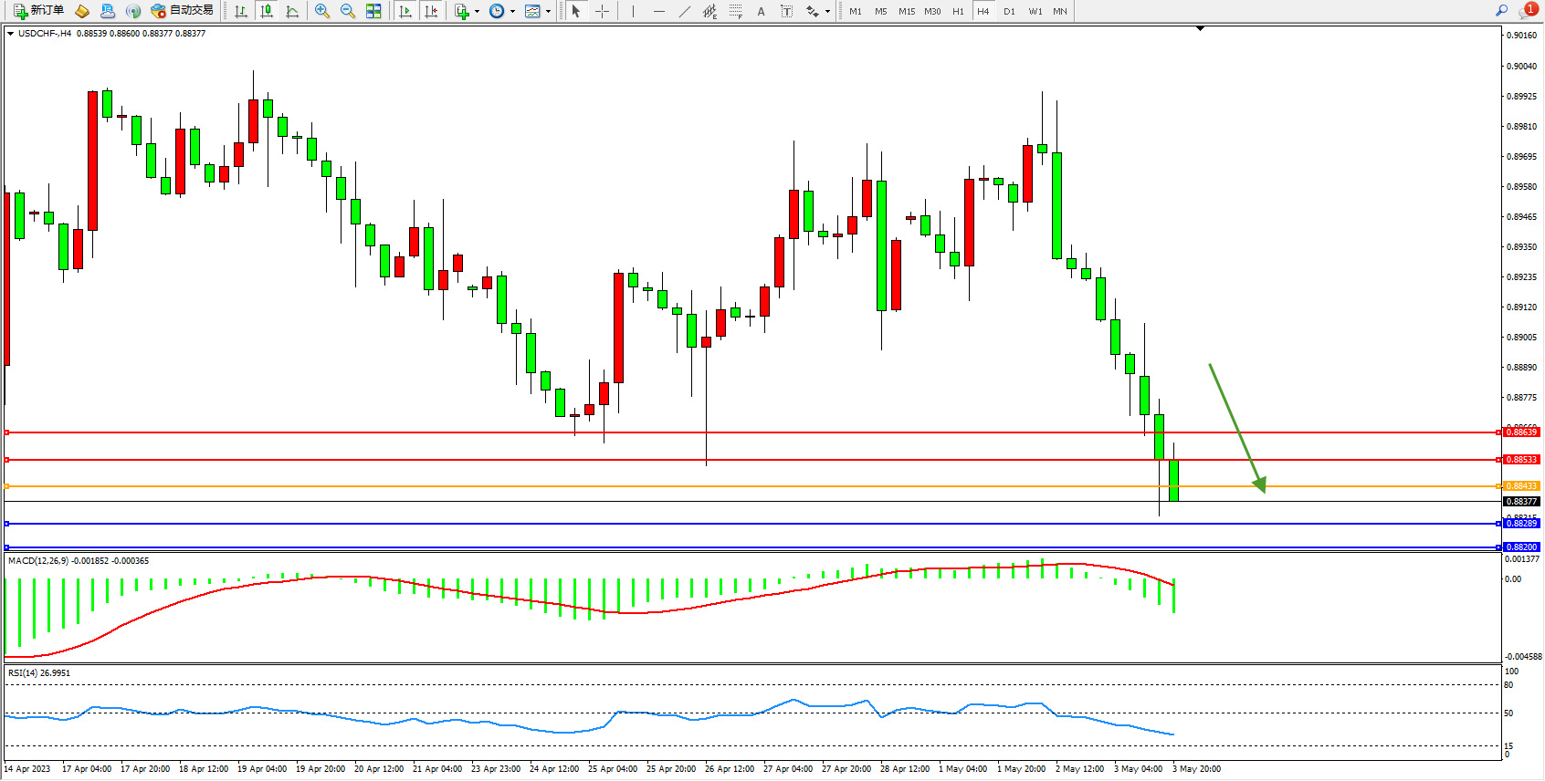 美元瑞郎USDCHF——4小时K线图显示: