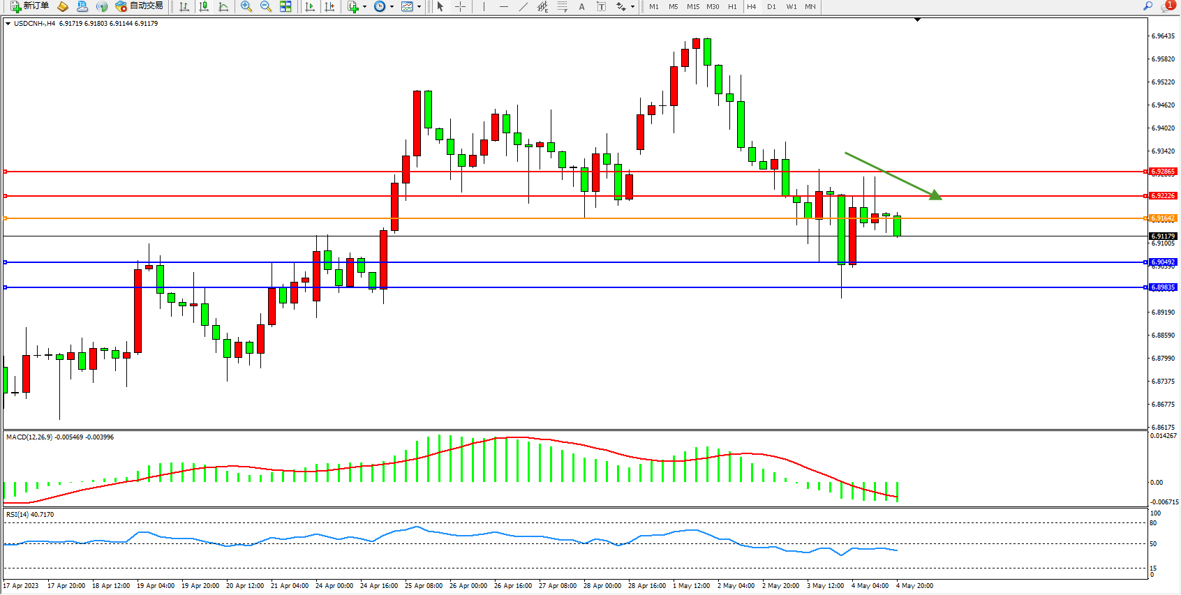 美元人民币USDCNH——4小时K线图显示: