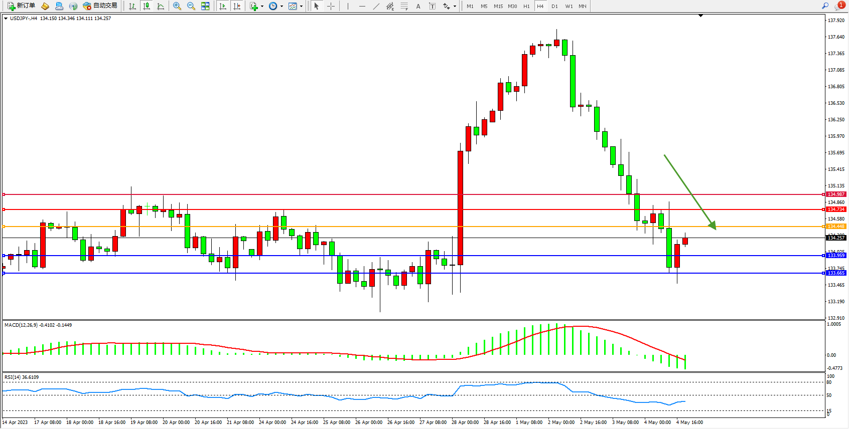 交易策略:134.448下方看跌,目标133.959  133.665