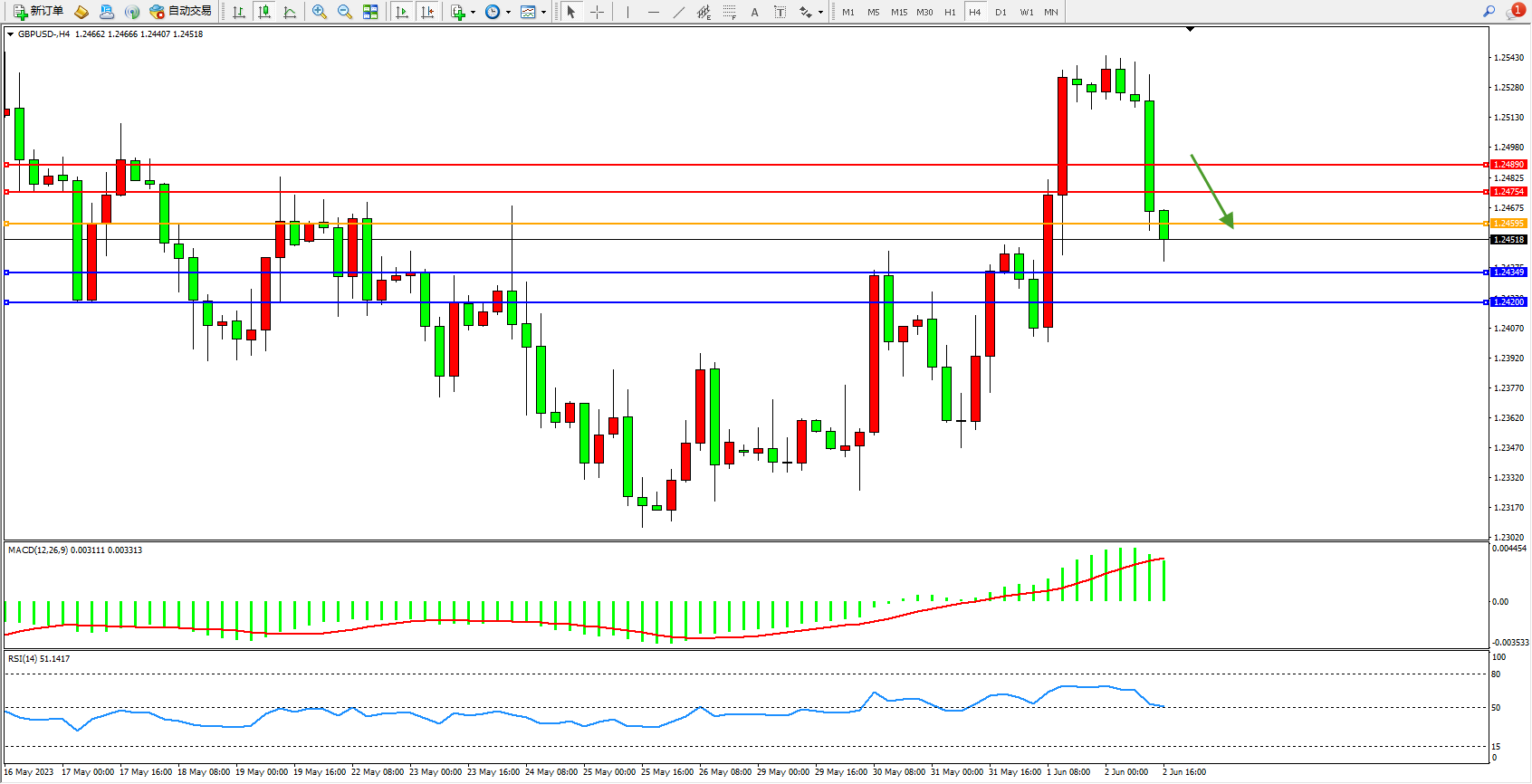 交易策略:1.24595下方看跌,目标1.24349  1.24200