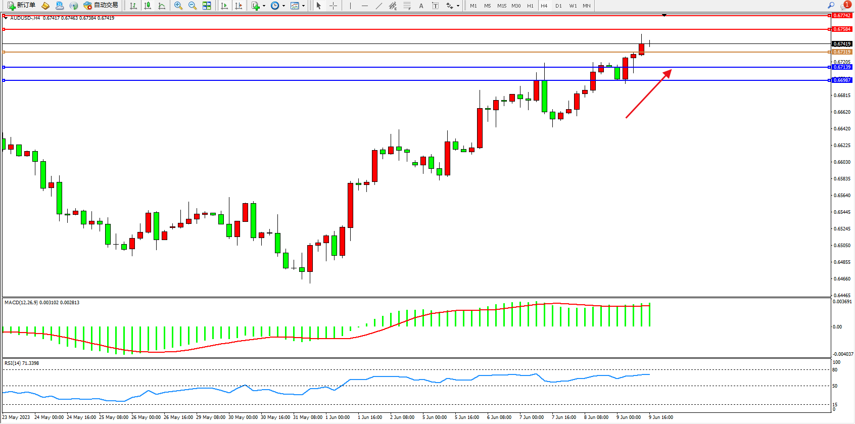 交易策略:0.67319上方看涨,目标0.67584  0.67742