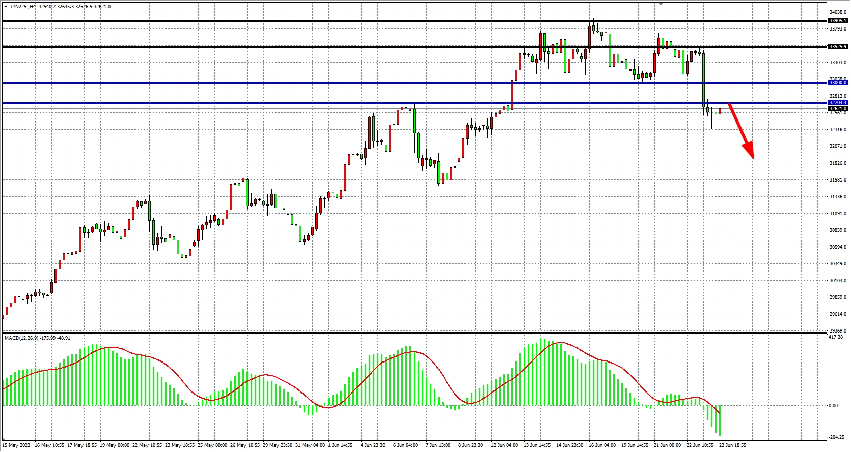 周五(6月23日)收盘下跌493.88点,跌幅1.48%,报32771.00点。今年4月以来,日本股市在全球表现“一骑绝尘,尽管短期外资配置日股的情绪高涨,本轮日股上涨的可持续性或值得质疑。