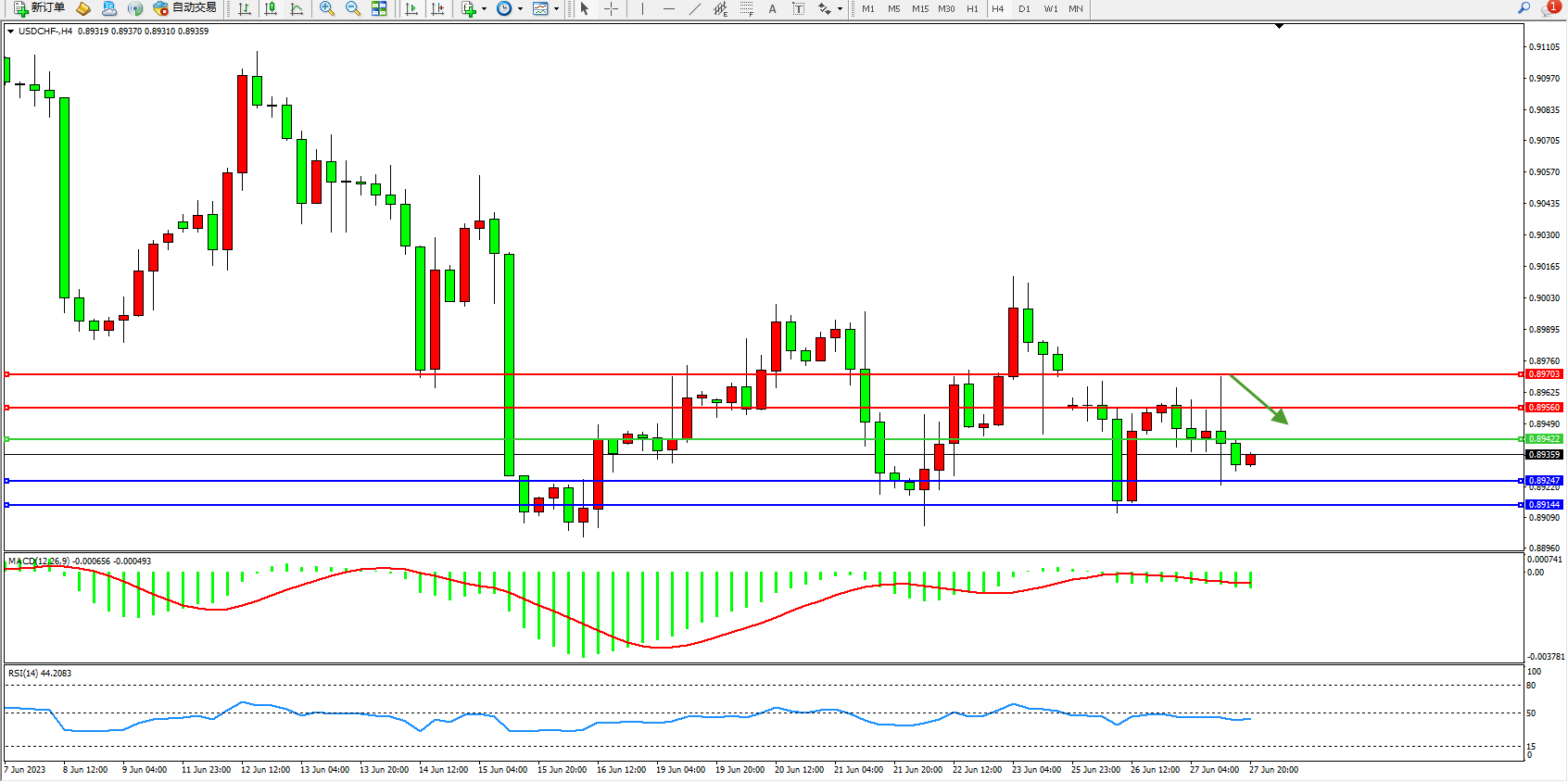 美元瑞郎USDCHF——4小时K线图显示: