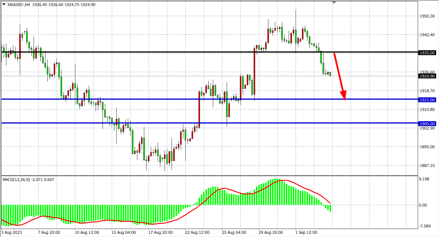 4小时图看,黄金跌破1935后形成短期顶部,行情进入跌势,阻力关注1935附近,支撑关注1915-1905附近。