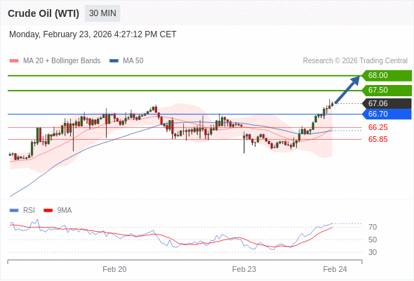 在 66.70 之上,看涨,目标价位为 67.50 ,然后为 68.00 。