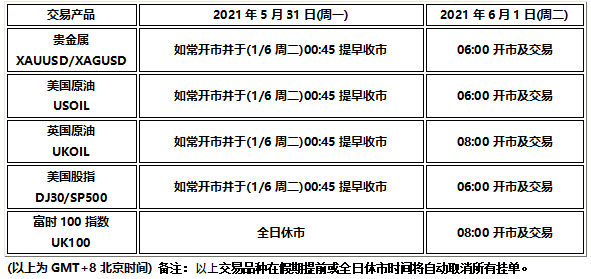 因应20215月31(周一)为美国阵亡将士纪念日(Memorial Day)及英国市场春季银行假期(Spring Banking Holiday),以下产品的交易时间将于假期期间提早或全日休市,敬请阁下知悉留意