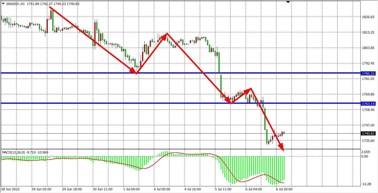 1小时图看,金价维持在1785之下运行,再连破支撑,MACD柱体于零轴之下继放大,市场看空情绪强烈,目前阻力已下移至1763,在1763之下维持看跌,目标1730-1700