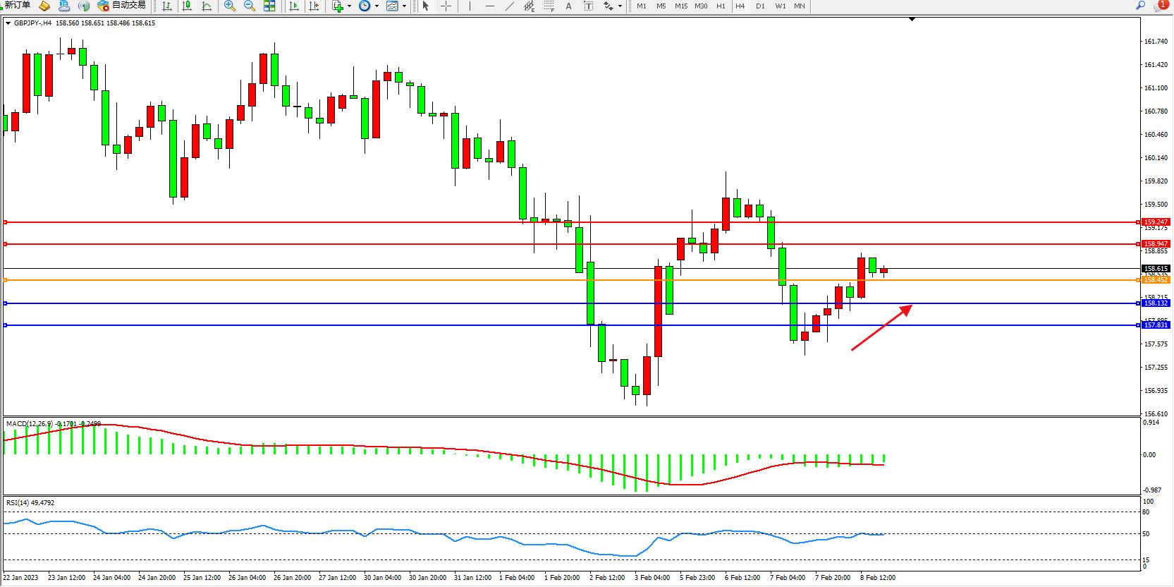 备选策略:158.452下方看跌,目标158.132、157.831
