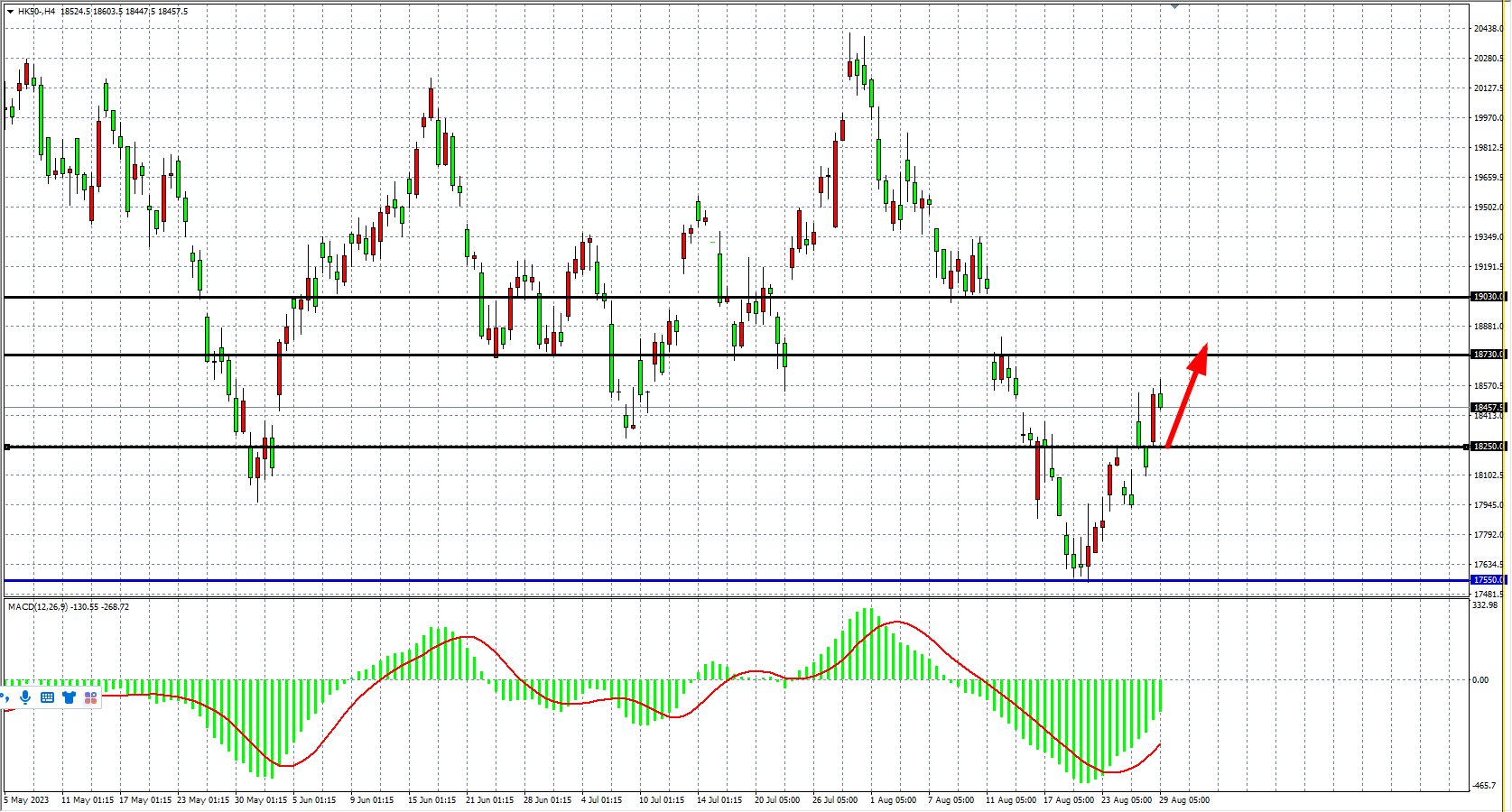 交易策略:18250  上方看涨,目标 18730  19030