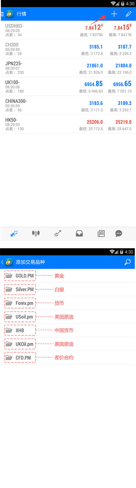 2.点击行情页面右上角的【+】,添加交易品种。