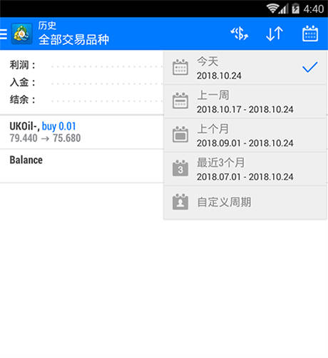 点击菜单栏的“历史”图标,可按今天、上一周、上个月、最近三个月、自定义周期查看交易历史订单。